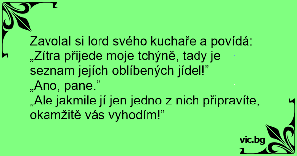 Zavolal si lord svého kuchaře a povídá: „Zítra přijede moje tchýně, tady je seznam jejích oblíbených jídel!”