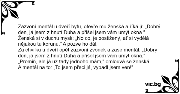 Zazvoní mentál u dveří bytu, otevře mu ženská a říká jí: „Dobrý den, já jsem z hnutí Duha a přišel jsem vám umýt okna.”