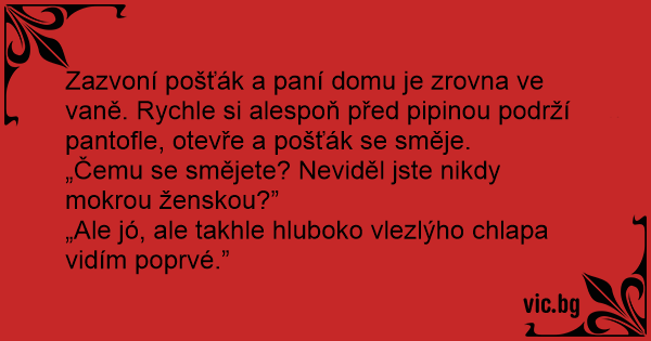Zazvoní pošťák a paní domu je zrovna ve vaně. Rychle si alespoň před pipinou podrží pantofle, otevře a pošťák se směje.
