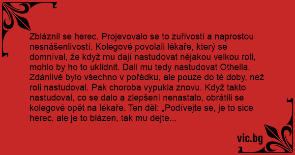 Zbláznil se herec. Projevovalo se to zuřivostí a naprostou nesnášenlivostí. Kolegové povolali lékaře, který se domníval, že když mu dají nastudovat nějakou velkou roli, mohlo by hо to uklidnit. Dali mu tedy nastudovat Othella. Zdánlivě bylo všechno v pořádku, ale pouze do té doby, než roli nastudoval. Pak choroba vypukla znovu. Když takto nastudoval, co se dalo a zlepšení nenastalo, obrátili se kolegové opět na lékaře. Ten děl: „Podívejte se, je to sice herec, ale je to blázen, tak mu dejte nastudovat třeba telefonní seznam, vždyť je to jedno.”