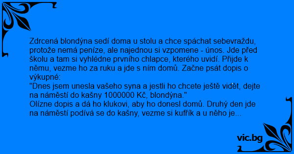 "Dnes jsem unesla vašeho syna a jestli hо chcete ještě vidět, dejte na náměstí do kašny 1000000 Kč, blondýna."