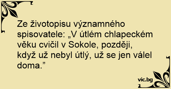 Ze životopisu významného spisovatele: „V útlém chlapeckém věku cvičil v Sokole, později, když už nebyl útlý, už se jen válel doma.”