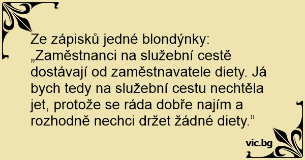 Ze zápisků jedné blondýnky: „Zaměstnanci na služební cestě dostávají od zaměstnavatele diety. Já bych tedy na služební cestu nechtěla jet, protože se ráda dobře najím a rozhodně nechci držet žádné diety.”
