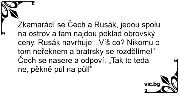 Zkamarádí se Čech a Rusák, jedou spolu na ostrov a tam najdou poklad obrovský ceny. Rusák navrhuje: „Víš co? Nikomu o tom neřeknem a bratrsky se rozdělíme!”