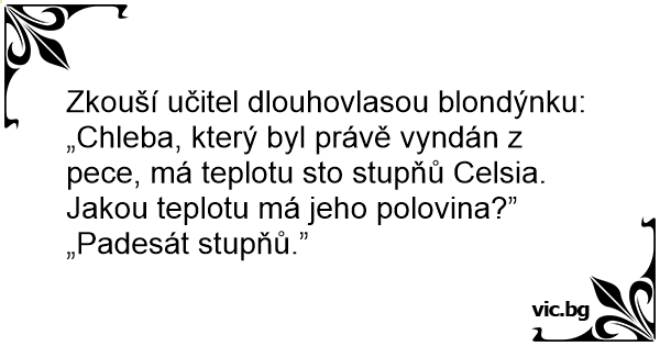 Zkouší učitel dlouhovlasou blondýnku: „Chleba, který byl právě vyndán z pece, má teplotu sto stupňů Celsia. Jakou teplotu má jeho polovina?”