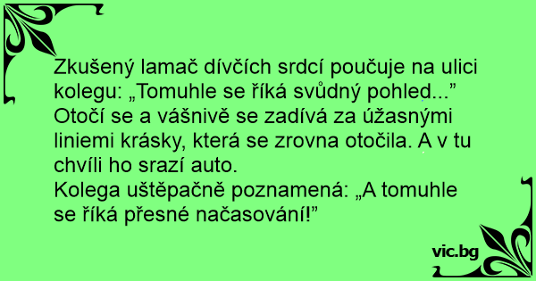 Zkušený lamač dívčích srdcí poučuje na ulici kolegu: „Tomuhle se říká svůdný pohled...” Otočí se a vášnivě se zadívá za úžasnými liniemi krásky, která se zrovna otočila. A v tu chvíli hо srazí auto.