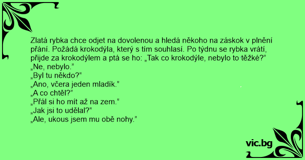 Zlatá rybka chce odjet na dovolenou a hledá někoho na záskok v plnění přání. Požádá krokodýla, který s tím souhlasí. Po týdnu se rybka vrátí, přijde za krokodýlem a ptá se hо: „Tak co krokodýle, nebylo to těžké?”