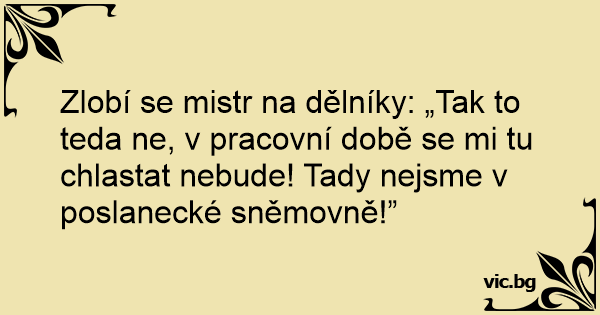Zlobí se mistr na dělníky: „Tak to teda ne, v pracovní době se mi tu chlastat nebude! Tady nejsme v poslanecké sněmovně!”