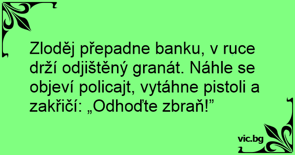 Zloděj přepadne banku, v ruce drží odjištěný granát. Náhle se objeví policajt, vytáhne pistoli a zakřičí: „Odhoďte zbraň!”