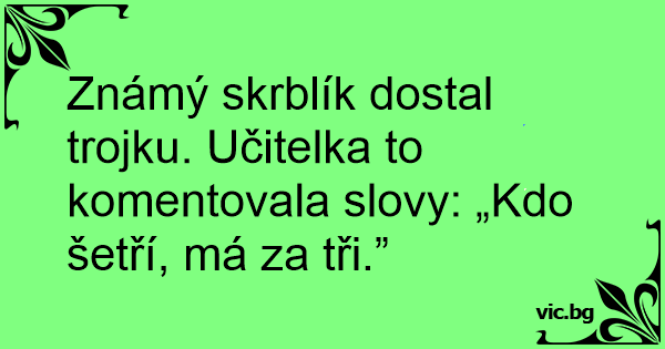 Známý skrblík dostal trojku. Učitelka to komentovala slovy: „Kdo šetří, má za tři.”