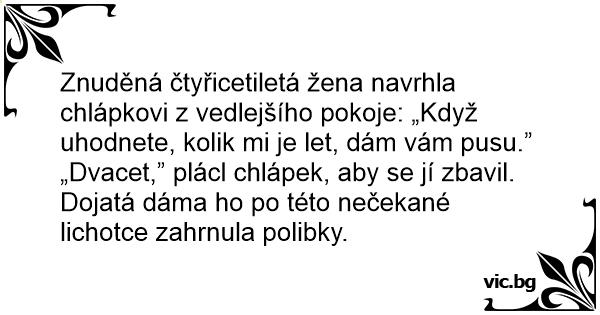 Znuděná čtyřicetiletá žena navrhla chlápkovi z vedlejšího pokoje: „Když uhodnete, kolik mi je let, dám vám pusu.”