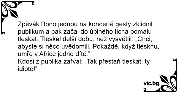 Zpěvák Bono jednou na koncertě gesty zklidnil publikum a pak začal do úplného ticha pomalu tleskat. Tleskal delší dobu, než vysvětlil: „Chci, abyste si něco uvědomili. Pokaždé, když tlesknu, umře v Africe jedno dítě.”