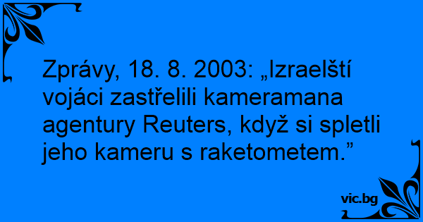 Zprávy, 18. 8. 2003: „Izraelští vojáci zastřelili kameramana agentury Reuters, když si spletli jeho kameru s raketometem.”