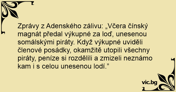 Zprávy z Adenského zálivu: „Včera čínský magnát předal výkupné za loď, unesenou somálskými piráty. Když výkupné uviděli členové posádky, okamžitě utopili všechny piráty, peníze si rozdělili a zmizeli neznámo kam i s celou unesenou lodí.”