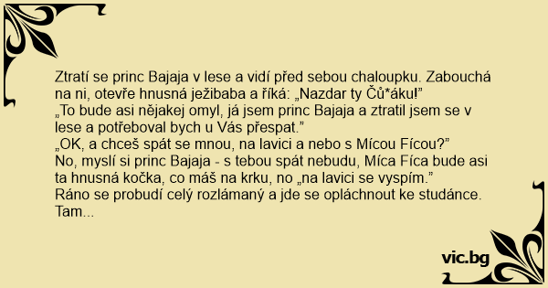 Ztratí se princ Bajaja v lese a vidí před sebou chaloupku. Zabouchá na ni, otevře hnusná ježibaba a říká: „Nazdar ty Čů*áku!”