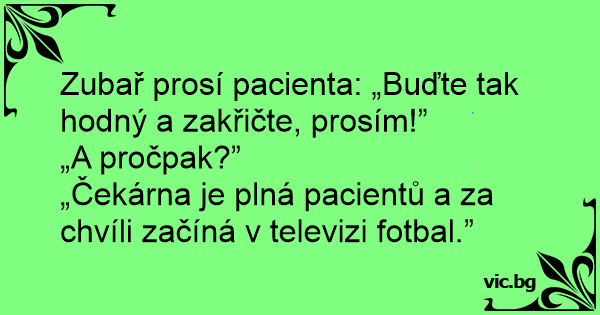 - Te rog, urla cat poti Tu de tare! imi zise dentistul. - Dar de ce as face Asta? il intreb. - Sala de asteptare e plina, Iar peste 10 minute incepe meciul Steaua - Molde!