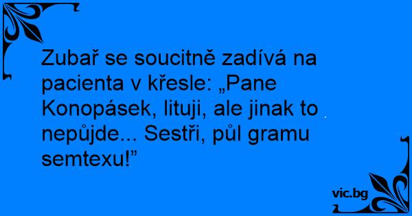 Zubař se soucitně zadívá na pacienta v křesle: „Pane Konopásek, lituji, ale jinak to nepůjde... Sestři, půl gramu semtexu!”
