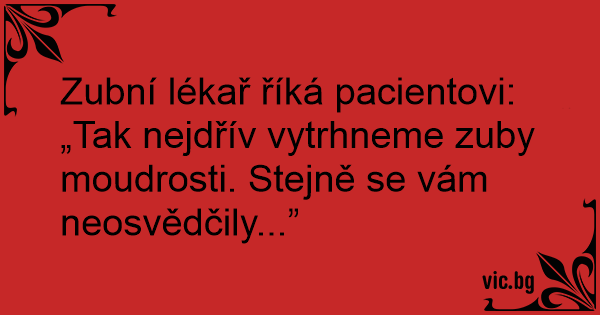 Zubní lékař říká pacientovi: „Tak nejdřív vytrhneme zuby moudrosti. Stejně se vám neosvědčily...”