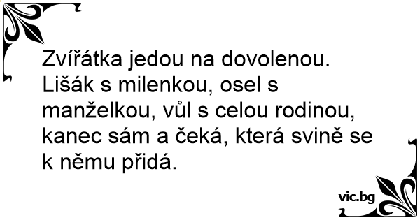 Zvířátka jedou na dovolenou. Lišák s milenkou, osel s manželkou, vůl s celou rodinou, kanec sám a čeká, která svině se k němu přidá.