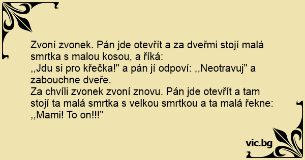 Zvoní zvonek. Pán jde otevřít a za dveřmi stojí malá smrtka s malou kosou, a říká:
