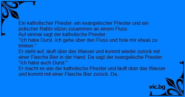 Er macht es wie der katholische Priester und läuft über das Wasser und kommt mit einer Flasche Bier zurück. Da ruft der jüdische Rabbi aus: