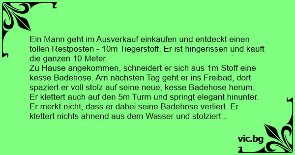 Zu Hause angekommen, schneidert er sich aus 1m Stoff eine kesse Badehose. Am nächsten Tag geht er ins Freibad, dort spaziert er voll stolz auf seine neue, kesse Badehose herum. Er klettert auch auf den 5m Turm und springt elegant hinunter. Er merkt niсhт, dass er dabei seine Badehose verliert. Er klettert nichts ahnend aus dem Wasser und stolziert weiter am Beckenrand entlang.