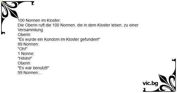 Abbedissan har samlat alla sina nunnor för att ta upp en viktig sak. - Igår hittade jag en kondom i klostret! 99 nunnor: - Å nej!! 1 nunna: - He, he, he!! - Kondomen har varit använd! 99...