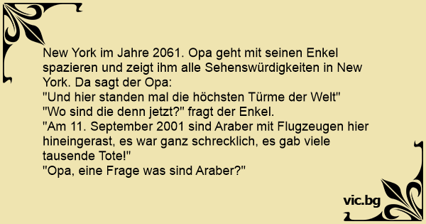 "Am 11. September 2001 sind Araber mit Flugzeugen hier hineingerast, es war ganz schrecklich, es gab viele tausende Tote!"