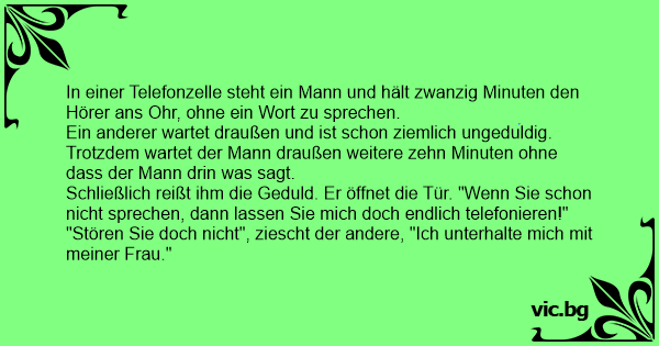 In einer Telefonzelle steht ein Mann und hält zwanzig Minuten den Hörer ans Ohr, ohne ein Wort zu sprechen.