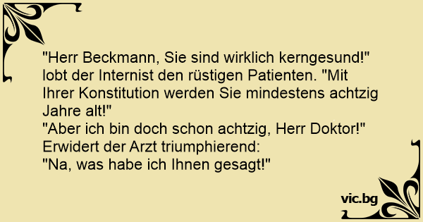 "Herr Beckmann, Sie sind wirklich kerngesund!" lobt der Internist den rüstigen Patienten. "Mit Ihrer Konstitution werden Sie mindestens achtzig Jahre alt!"