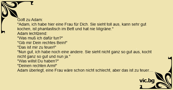 En dag när Adam gick i paradiset så frågade han Gud om inte denne kunde fixa fram en partner åt honom. "Jodå," sa Gud. "Men det kostar dig höger öra, vänster arm, tre fingrar på höger hand, höger...
