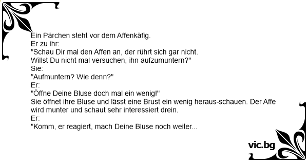 Geht ein Pärchen im Zoo spazieren. Vor dem Käfig eines mächtigen Gorillas bleiben sie stehen. Der Gorilla sieht die Frau und scheint sie geil zu finden. Der Mann ist begeistert und sagt zu seiner...