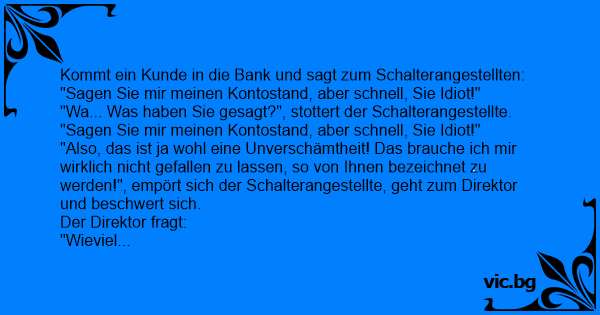 "Na, dann sagen Sie ihm seinen Kontostand, aber schnell, Sie Idiот!"