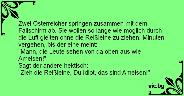 Парашутист новобранец скача за пръв път. Пада и радостно говори на колегите си по радиото: - Каква красота! Какво чувство за свобода! Каква гледка! Хората долу ги виждам дребни като мравки. - Идиот, дърпай шнура! Това наистина са мравки.