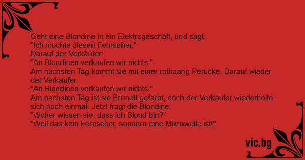 Kommt eine Blondine in ein Elektrogeschäft. Sagt sie: Ich hätte bitte gern den Fernseher dort drüben. Sagt der Verkäufer: Tut mir leid, an Blondinen verkaufen wir nicht. Die Blondine färbt sich die...