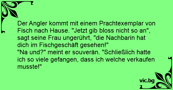 Der Angler kommt mit einem Prachtexemplar von Fisch nach Hause. "Jetzt gib bloss niсhт so an", sagt seine Frau ungerührt, "die Nachbarin hat dich im Fischgeschäft gesehen!"