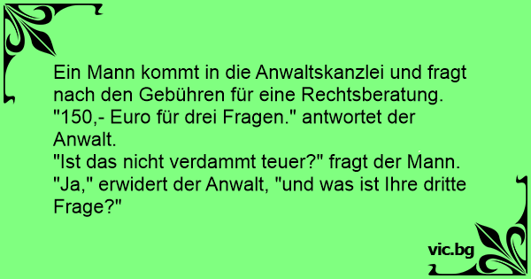 Der Anwalt erklärt: “Ich bin ein Spitzenjurist und meine Zeit ist Gold wert! Daher dürfen Sie mir für die 150 Euro Honorar nur 3 Fragen stellen!” Darauf der Mandant: “Drei Fragen für 150 Euro? Ist...