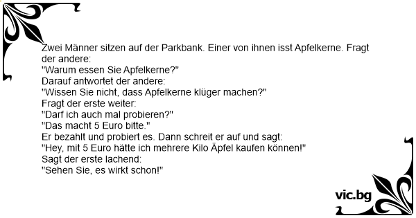 Sitzen zwei Männer im Zug. Der eine isst Apfelkerne. Da fragt der andere: "Warum essen sie denn Apfelkerne?" "Das macht intelligent." "Darf ich auch welche haben?" "Ja, für fünf Euro." Er bezahlt...