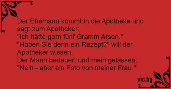 Kommt ein Mann in die Apotheke und verlangt 50 Gramm Arsen. Fragt der Verkäufer: "Haben Sie dafür ein Rezept?" "Nein, aber ein Bild von meiner Schwiegermutter..."