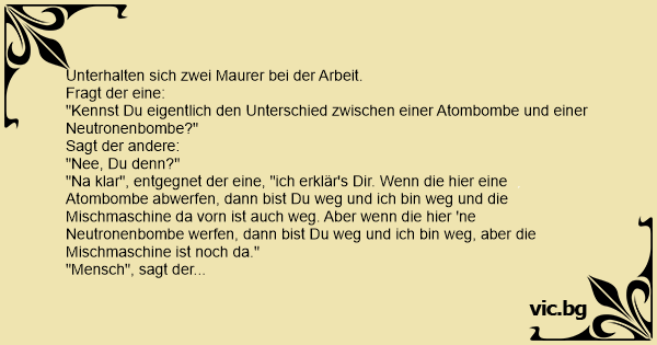 "Na klar", entgegnet der eine, "ich erklär's Dir. Wenn die hier eine Atombombe abwerfen, dann bist Du weg und ich bin weg und die Mischmaschine da vorn ist auch weg. Aber wenn die hier 'ne Neutronenbombe werfen, dann bist Du weg und ich bin weg, aber die Mischmaschine ist noch da."