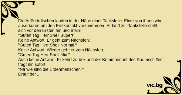 Da landen zwei Außerirdische mit ihrem Raumschiff direkt an einer alten Tankstelle in Texas. Sagte der eine zur Zapfsäule: