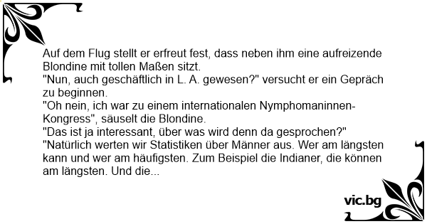 Ein Mann und eine Frau sitzen nebeneinander im Flugzeug. Ganz aufgeregt erzählt die Frau: "Ich komme gerade von einem internationalen Frauenkongreß. Dort haben wir mit ein paar alten Vorurteilen aufgeräumt. Nicht die Franzosen sind die besten Liebhaber, sondern die Polen, und nicht die Italiener...