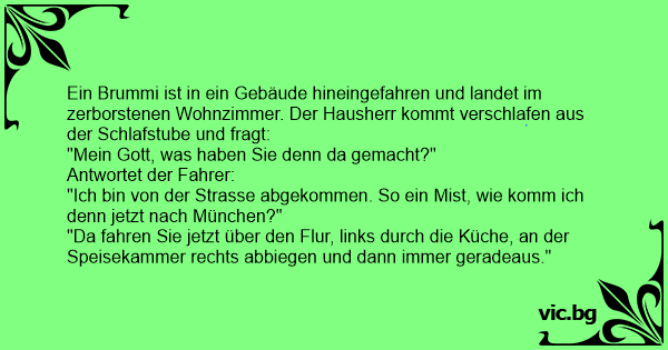 Ein Brummi ist in ein Gebäude hineingefahren und landet im zerborstenen Wohnzimmer. Der Hausherr kommt verschlafen aus der Schlafstube und fragt:
