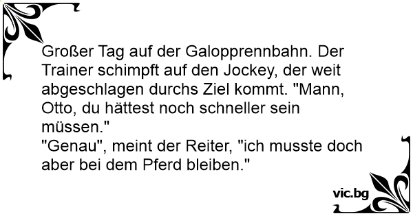 Großer Tag auf der Galopprennbahn. Der Trainer schimpft auf den Jockey, der weit abgeschlagen durchs Ziel kommt. "Mann, Otto, du hättest noch schneller sein müssen."