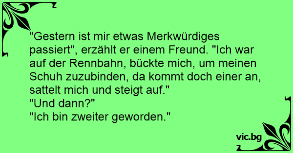 "Gestern ist mir etwas Merkwürdiges passiert", erzählt er einem Freund. "Ich war auf der Rennbahn, bückte mich, um meinen Schuh zuzubinden, da kommt doch einer an, sattelt mich und steigt auf."