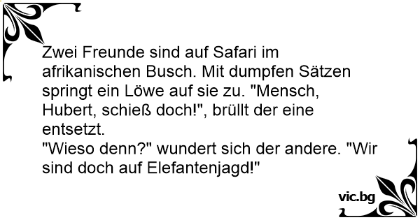 Zwei Freunde sind auf Safari im afrikanischen Busch. Mit dumpfen Sätzen springt ein Löwe auf sie zu. "Mensch, Hubert, schieß doch!", brüllt der eine entsetzt.