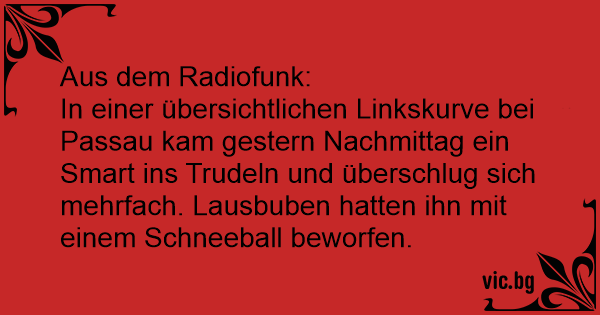 In einer übersichtlichen Linkskurve bei Passau kam gestern Nachmittag ein Smart ins Trudeln und überschlug sich mehrfach. Lausbuben hatten ihn mit einem Schneeball beworfen.