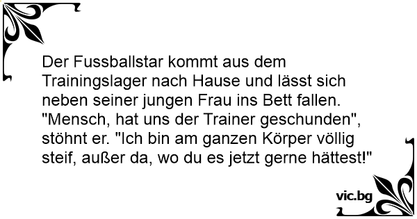 "Mensch, hat uns der Trainer geschunden", stöhnt er. "Ich bin am ganzen Körper völlig steif, außer da, wo du es jetzt gerne hättest!"
