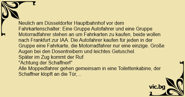 Neulich am Düsseldorfer Hauptbahnhof vor dem Fahrkartenschalter: Eine Gruppe Autofahrer und eine Gruppe Motorradfahrer stehen an um Fahrkarten zu kaufen, beide wollen nach Frankfurt zur IAA. Die Autofahrer kaufen für jeden in der Gruppe eine Fahrkarte, die Motorradfahrer nur eine einzige. Große Augen bei den Dosentreibern und leichtes Getuschel.