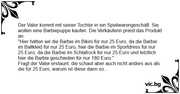 Přijde pán do obchodu a ptá se: „Za kolik máte panenku Barbie?” „Kterou máte namysli? Máme Barbie jede na dovolenou za 500 Kč, Barbie uklízí za 550 Kč, Barbie v koupelně za 600 Kč a Rozvedenou...